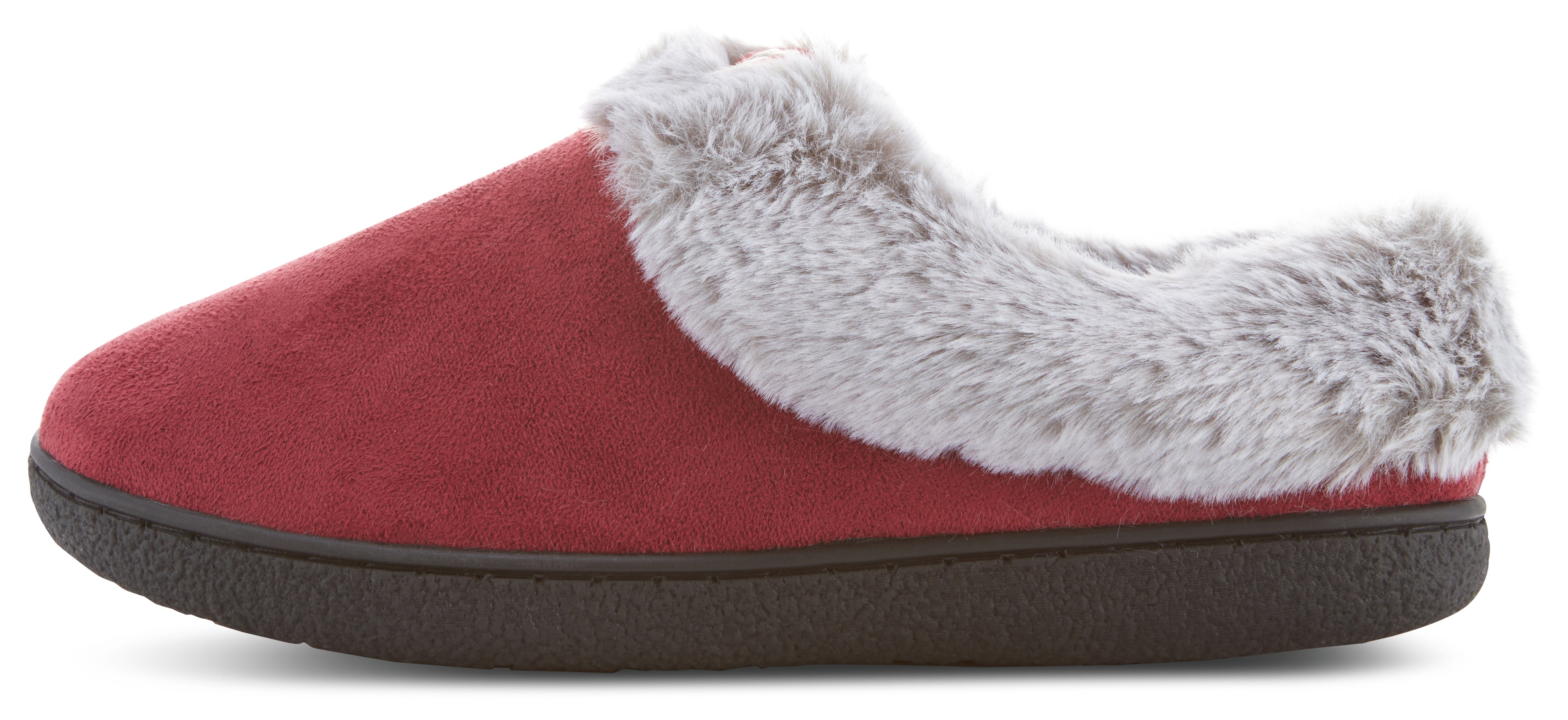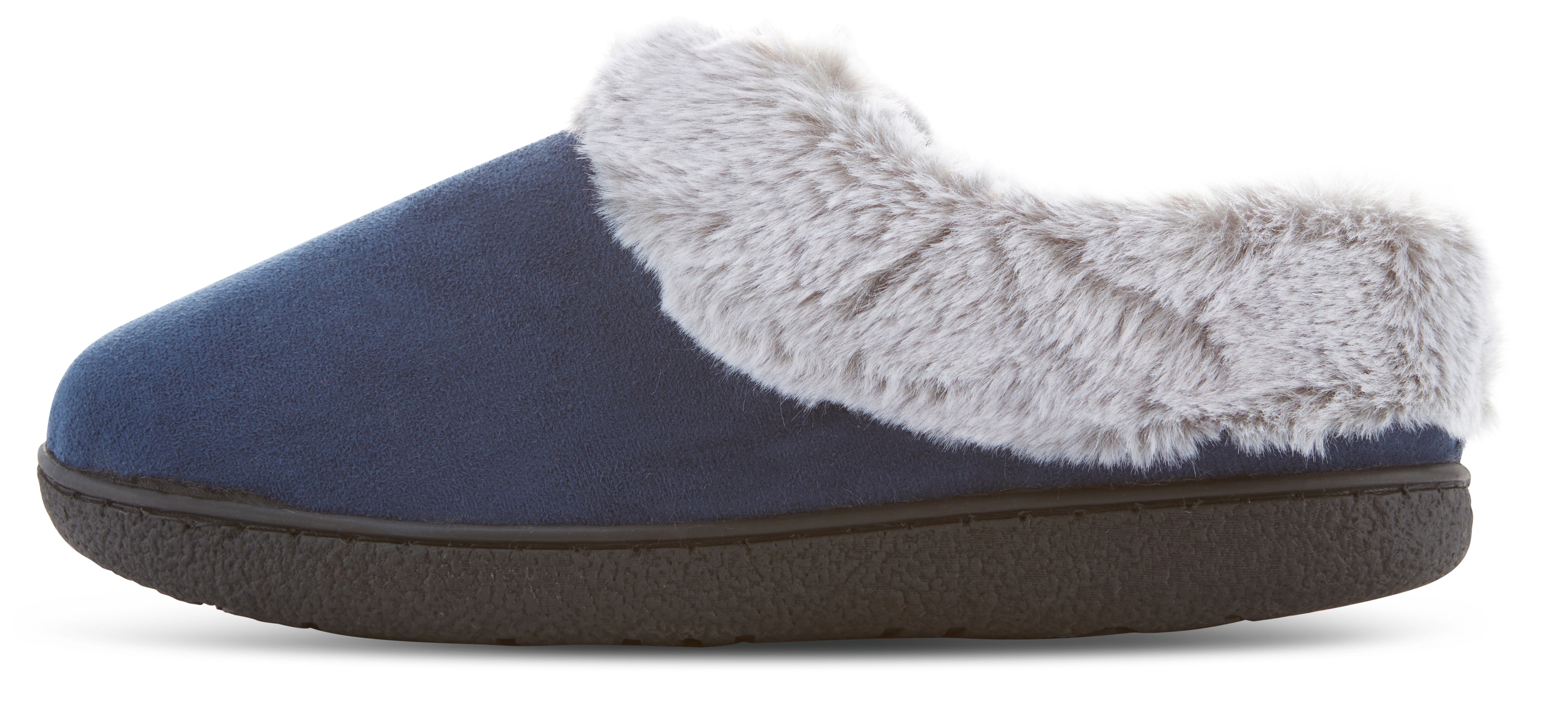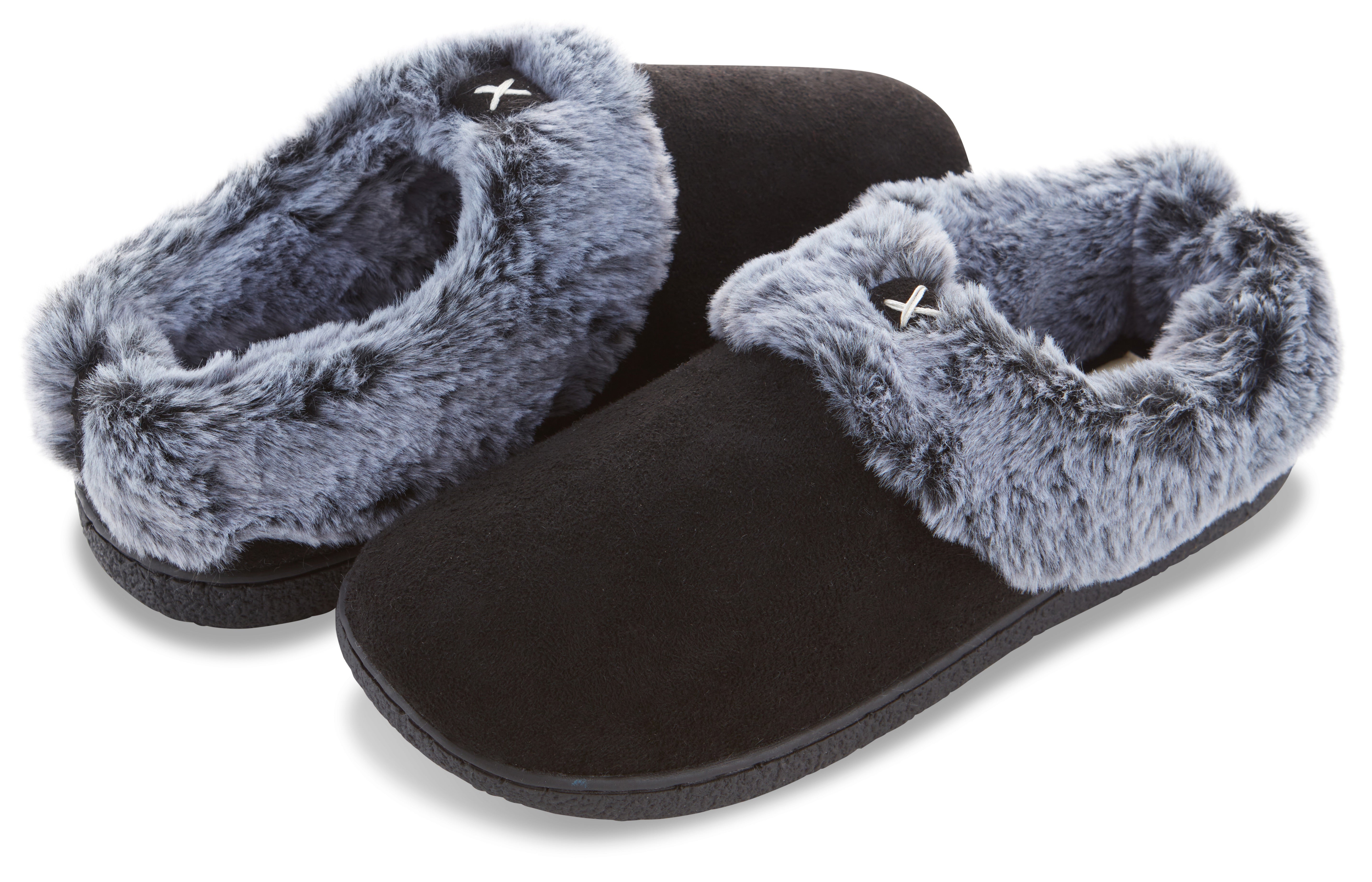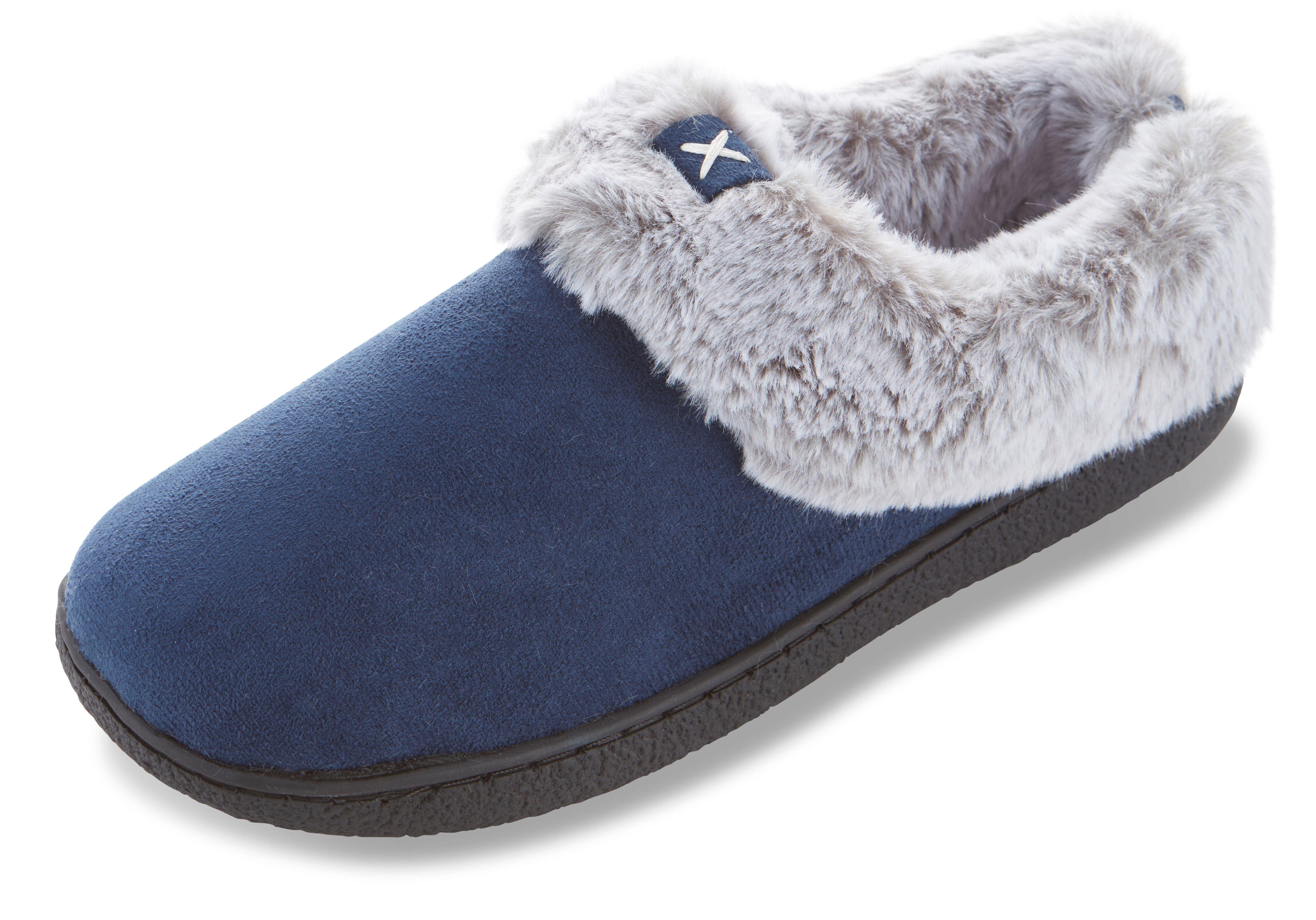 Slip into comfort and style with our Microsuede Closed Back Clog Slipper. The soft microsuede upper is paired with a plush faux fur collar, finished with a playful “X” patch for a touch of charm. Inside, velour lining and a memory foam insole keep your feet warm, cushioned, and cozy. The closed-back design gives you a secure fit, while the durable anti-skid outsole makes these slippers perfect for both relaxing indoors and stepping outside in comfort.